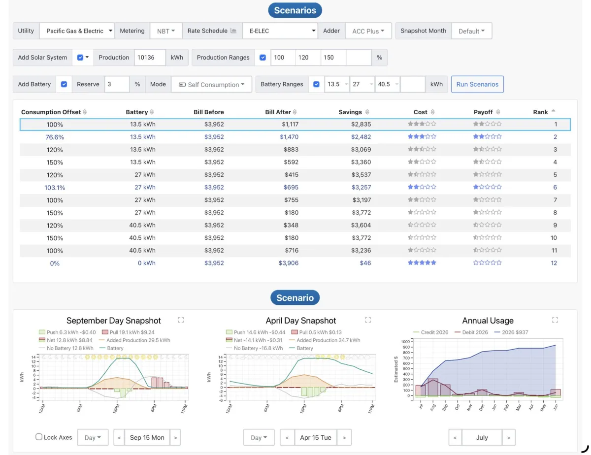 Accuracy really comes down to how precise the analysis is before anything gets installed. We use SolarFax to pull your actual utility data and then run multiple scenarios based on how and when you use electricity, along with PG&E’s peak rates. That allows us to design a system that’s tailored to your real usage—not a guess or a generic estimate.